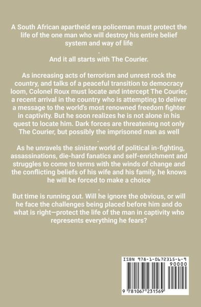 A South African apartheid era policeman must protect the life of the one man who will destroy his entire belief system and way of life. And it all starts with The Courier. As increasing acts of terrorism and unrest rock the country, and talks of a peaceful transition to democracy loom, Colonel Roux must locate and intercept The Courier, a recent arrival in the country who is attempting to deliver a message to the world's most renowned freedom fighter in captivity. But he soon realizes he is not alone in his quest to locate him. Dark forces are threatening not only The Courier, but possibly the imprisoned man as well. As he unravels the sinister world of political in-fighting, assassinations, die-hard fanatics and self-enrichment and struggles to come to terms with the winds of change and the conflicting beliefs of his wife and his family, he knows he will be forced to make a choice. But time is running out. Will he ignore the obvious, or will he face the challenges being placed before him and do what is right-protect the life of the man in captivity who represents everything he fears?