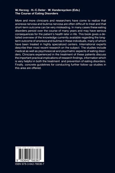I: General Aspects of Follow-up Research.- The Significance of Follow-up Investigations.- Long-Term Course of Anorexia Nervosa: A Review of the Literature.- Outcome Assessment.- The Anorexia Nervosa Symptom Score: A Multidimensional Tool for Evaluating the Course of Anorexia Nervosa.- Follow-up of Males with Eating Disorders.- II: Follow-up Studies of Anorexia and Bulimia Nervosa.- The Heidelberg-Mannheim Study: Long-Term Follow-up of Anorexia Nervosa Patients at the University Medical Center - Background and Preliminary Results.- Somatic Findings at 12-Year Follow-up of 103 Anorexia Nervosa Patients: Results of the Heidelberg-Mannheim Follow-up.- A Prospective Follow-up Study in Early-Onset Eating Disorders.- Long-Term Outcome in Anorexia Nervosa Inpatients.- The German Longitudinal Bulimia Nervosa Study I.- Long-Term Follow-up of Bulimic Patients Treated in Integrated Behavioural and Psychodynamic Treatment Programmes.- A Long-Term Follow-up Study of Outpatients with Bulimia Nervosa Treated in a Structured Group Psychotherapy Program.- A Large-Scale Longitudinal Follow-up Study of Patients with Eating Disorders: Methodological Issues and Preliminary Results.- The Prognosis of Eating Disorders: A Clinician's Approach.- Chronicity in Anorexia Nervosa: Results from the Swedish Long-Term Study.- What Can We Learn from Long-Term Outcome of Anorexia and Bulimia Nervosa?.- III: Special Issues.- Genetic Determinants in Anorexia Nervosa: Results of Studies in Twins.- Menstrual Disorder and Other Hormonal Disturbances.- Aspects of the Natural History of Normal and Disordered Eating and Some Methodological Considerations.- Important Factors in the Process of Recovery According to Patients with Anorexia Nervosa.- Social Support and Long-Term Course of Anorexia Nervosa.- EgoStrength, Object Relations, and Life Events as Outcome Predictors in Restricting Anorexia Nervosa and Normal-Weight Bulimia Nervosa.- What Happened to the "Tasting Girls"? A Follow-up in Retrospect.- Treatment of Anorexia Nervosa: An Interview.- Outlook.