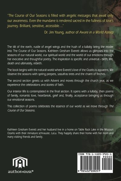 The Course of Our Seasons is filled with angelic messages that await only our awareness. Even the mundane is rendered sacred in the fullness of love's journey. Brilliant, sensitive, accessible... Dr. Jim Young, AWARE IN A WORLD ASLEEP The tilt of the earth, rustle of angel wings and the hush of a lullaby bring the reader into The Course of Our Seasons. Kathleen Gresham Everett allows us glimpses into the seasons of our natural world, our spiritual world and the world of our emotions through her evocative and thoughtful poetry. The inspiration is specific and universal - birth, life, death and ultimately, rebirth. The book begins with the natural world where Everett's love of the Ozarks is apparent. We observe the seasons with spring peepers, sassafras trees and the charm of finches. The second section greets us with Advent and moves through the church year, as we experience the celebrations and stories of faith. Our interior life is contemplated in the final section. It opens with a lullaby, then poems of family, romantic love, heartbreak, grief and, finally, acceptance bringing us through our emotional seasons. This collection of poems celebrates the essence of our world as we move through The Course of Our Seasons.