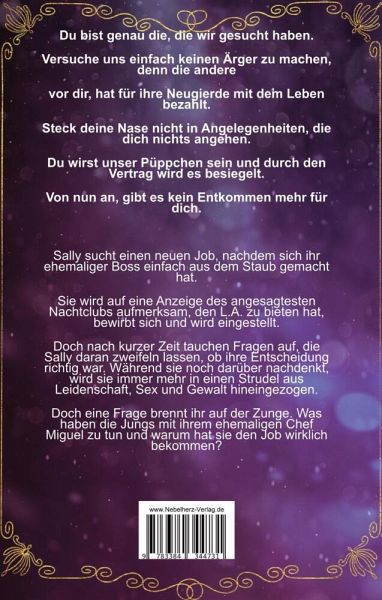Du bist genau die, die wir gesucht haben.Versuche uns einfach keinen Ärger zu machen, denn die anderevor dir, hat für ihre Neugierde mit dem Leben bezahlt.Steck deine Nase nicht in Angelegenheiten, die dich nichts angehen.Du wirst unser Püppchen sein und durch den Vertrag wird es besiegelt.Von nun an, gibt es kein Entkommen mehr für dich.Sally sucht einen neuen Job, nachdem sich ihr ehemaliger Boss einfach aus dem Staub gemacht hat.Sie wird auf eine Anzeige des angesagtesten Nachtclubs aufmerksam, den L.A. zu bieten hat, bewirbt sich und wird eingestellt.Doch nach kurzer Zeit tauchen Fragen auf, die Sally daran zweifeln lassen, ob ihre Entscheidung richtig war. Während sie noch darüber nachdenkt, wird sie immer mehr in einen Strudel aus Leidenschaft, Sex und Gewalt hineingezogen.Doch eine Frage brennt ihr auf der Zunge. Was haben die Jungs mit ihrem ehemaligen Chef Miguel zu tun und warum hat sie den Job wirklich bekommen?