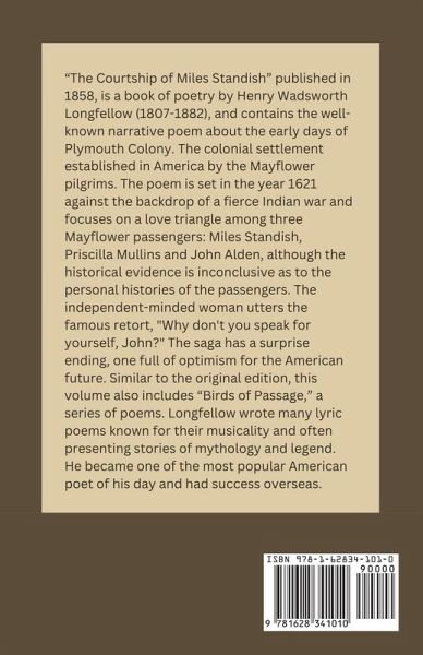Unique Element About the Author / Historical Context A BELOVED AMERICAN NARRATIVE POEM by HENRY WADSWORTH LONGFELLOW. The Courtship of Miles Standish and Other Poems, by AMERICAN author HENRY WADSWORTH LONGFELLOW (1807-1882) contains the well-known narrative story-poem about the early days of Plymouth Colony, the colonial settlement established in America by the Mayflower pilgrims. The narrative poem is followed by "Birds of Passage," a collection of poems including "The Ladder of St. Augustine," "The Phantom Ship," and "My Lost Youth." Longfellow wrote many lyric poems known for their musicality and often presenting stories of mythology and legend. He was among the most popular American poet of his day and had success overseas. Sneak Peak Still the Captain continued, unheeding the words of the stripling:"See, how bright they are burnished, as if in an arsenal hanging;That is because I have done it myself, and not left it to others.Serve yourself, would you be well served, is an excellent adage;So I take care of my arms, as you of your pens and your inkhorn. Title Details Originally published in 1858 American colonial narrative poem set in 1621