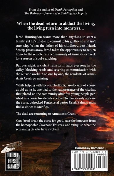When the dead return to abduct the living, the living turn into monsters... Jarod Huntingdon wants more than anything to start a family, yet he's unable to commit to his girlfriend and isn't sure why. When the father of his childhood best friend, Scotty, passes away, Jarod takes the opportunity to return home to the remote rural community of Annastasis Creek for a season of soul-searching. But overnight, a violent rainstorm traps everyone in the valley, blocking roads and severing communication with the outside world. And one by one, the residents of Annastasis Creek go missing. While helping with the search efforts, Jarod learns of a curse as old as he is, one tied to the reappearance of the cicadas, first placed on the community after five young people perished in a house fire decades before. To temporarily appease the curse, defrocked Pentecostal pastor Uriah Zalmon must find a sinner to sacrifice. The dead are returning to Annastasis Creek... Can Jarod break the curse for good, save the innocent from the homophobic Covenant Trustees, and vanquish what the screaming cicadas have awoken?