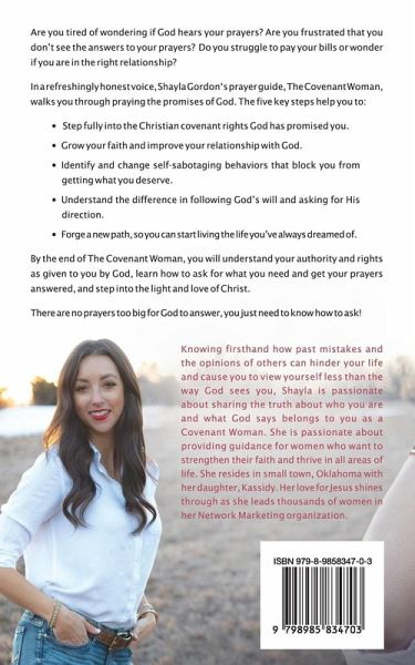 Are you tired of wondering if God hears your prayers? Are you frustrated that you don't see the answers to your prayers? Do you struggle to pay your bills or wonder if you are in the right relationship? In a refreshingly honest voice, Shayla Gordon's prayer guide, The Covenant Woman, walks you through praying the promises of God. The five key steps help you to:Step fully into the Christian covenant rights God has promised you. Grow your faith and improve your relationship with God. Identify and change self-sabotaging behaviors that block you from getting what you deserve. Understand the difference in following God's will and asking for His direction. Forge a new path, so you can start living the life you've always dreamed of. By the end of The Covenant Woman, you will understand your authority and rights as given to you by God, learn how to ask for what you need and get your prayers answered, and step into the light and love of Christ. There are no prayers too big for God to answer, you just need to know how to ask!