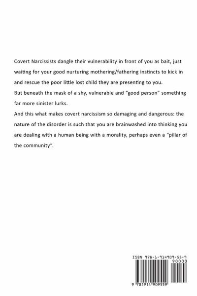 Still struggling from the effects of a narcissistic or psychopathically abusive relationship? DO THE FOLLOWING SYMPTOMS SOUND FAMILIAR? - Feelings of helplessness and despair - A desire to self isolate - Feeling desperately misunderstood - Overwhelming feelings of loss and grief - Extreme bouts of rage - An inability to be comfortable with yourself - Strange dreams - Extreme weight loss or weight gain - Uncharacteristic jealousy/ insecurity - Feeling like you don't know the difference between right and wrong - Extreme paranoia (being turned into an obsessive detective) Covert Narcissists dangle their vulnerability in front of you as bait, just waiting for your good nurturing mothering/fathering instincts to kick in and rescue the poor little lost child they are presenting to you. But beneath the mask of a shy, vulnerable and "good person" something far more sinister lurks. And this what makes covert narcissism so damaging and dangerous: the nature of the disorder is such that you are brainwashed into thinking you are dealing with a human being with a morality, perhaps even a "pillar of the community". OFT REPEATED MYTHS OF THE INTERNET ABOUT NARCISSISTS : You are Told: Narcissists are always brash, loud, assertive, flashy and Confident. The problem is: Coverts are quiet, insecure and passive. You are Told: Narcissists will never apologise for things they do. The problem is: Coverts can learn that a quick and TOTAL apology is a really slick way of getting their target to "go back to sleep" if it looks like they are waking up. You are told: Narcissists can be detected because they will always tell you how amazing they are and by bragging about their achievements. The problem is: Coverts are known for presenting themselves as vulnerable victims who can even use that vulnerability as a hook to bait you in!