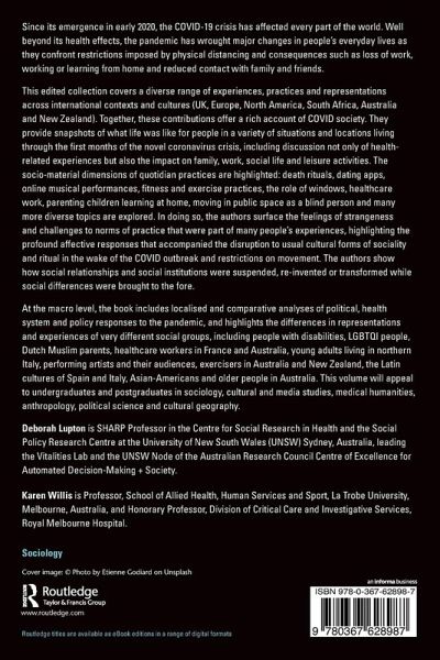 This edited collection covers a diverse range of experiences, practices and representations across international contexts and cultures (UK, Europe, North America, South Africa, Australia and New Zealand). Together, these contributions offer a rich account of COVID society. They provide snapshots of what life was like for people in a variety of situations and locations living through the first months of the novel coronavirus crisis, including discussion not only of health-related experiences but also the impact on family, work, social life and leisure activities. The socio-material dimensions of quotidian practices are highlighted: death rituals, dating apps, online musical performances, fitness and exercise practices, the role of windows, healthcare work, parenting children learning at home, moving in public space as a blind person and many more diverse topics are explored. In doing so, the authors surface the feelings of strangeness and challenges to norms of practice that were part of many people's experiences, highlighting the profound affective responses that accompanied the disruption to usual cultural forms of sociality and ritual in the wake of the COVID outbreak and restrictions on movement. The authors show how social relationships and social institutions were suspended, re-invented or transformed while social differences were brought to the fore.