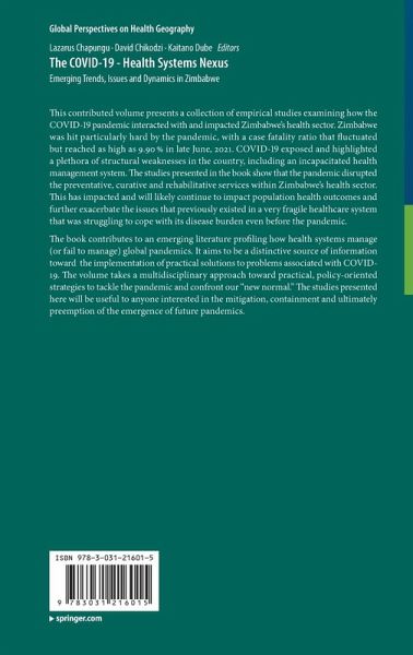 Part 1: Introduction.- Chapter 1: The COVID-19-Health Nexus: Trends and Dynamics.- Part 2: Health system dynamics in a COVID-19 environment.- Chapter 2: The COVID-19 Pandemic in Zimbabwe: A Spatial and Temporal Perspective.- Chapter 3: Public Safety and Health Systems in the Context of Covid-19 in Zimbabwe: Gaps and Prospects.- Chapter 4: Devolution as Health Governance Paradigm Amidst the Covid-19 Pandemic in Zimbabwe: Convergences and Divergences.- Chapter 5: The Global COVID-19 Pandemic: A Strategic Opportunity for Operationalizing One Health Approach in Zimbabwe.- Chapter 6: An Analysis of the Dynamics of COVID-19 Pandemic in Zimbabwe Using the Extended SEIR Model with Treatment and Quarantine.- Chapter 7: Indigenous health practices and lifestyles: Can they help Zimbabwe transform its health systems in the face of Covid-19 pandemic?.- Chapter 8: Virtual communities in supporting access to health services during COVID-19 pandemic: The Implications and Impacts on Zimbabwe's health system.- Part 3: COVID-19 restrictive measures and related impacts.- Chapter 9: Decongesting global cities as part of Health Reform in the era of COVID-19: Impacts and implications for Zimbabwe.- Chapter 10: Deciphering Synergies and Tradeoffs Between COVID-19 Measures and the Progress Towards SDG 15: Implications on Health Systems in Zimbabwe.- Chapter 11: The Impact of COVID-19 on Economic Development in Zimbabwe: Implications on the Health Delivery System.- Part 4: Vaccine uptake and diplomacy.- Chapter 12: COVID-19 Vaccination Hesitancy. Interrogating the Trends, Dynamics and Implications for the Health Delivery System in Zimbabwe.- Chapter 13: The Complexities of Public Health Communication on COVID-19 Vaccination in Social Media. Implications on Zimbabwe's Health System.- Chapter 14: COVID-19 vaccine diplomacy: Tracking the Chinese, Indian and Russian global pathways and undertones.- Part 5: Conclusion.- Chapter 15: The COVID-19-Health Systems Nexus: Conclusions, Emerging trends,Key findings and Policy implications.