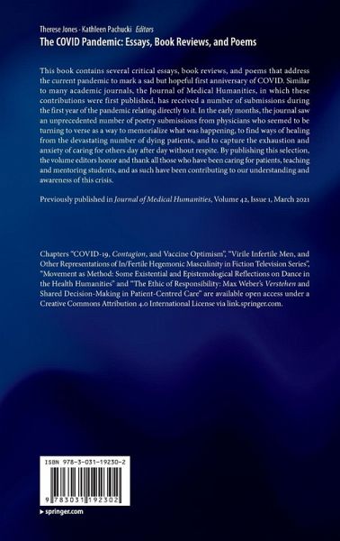 This book contains several critical essays, book reviews, and poems that address the current pandemic to mark a sad but hopeful first anniversary of COVID. Similar to many academic journals, the Journal of Medical Humanities, in which these contributions were first published, has received a number of submissions during the first year of the pandemic relating directly to it. In the early months, the journal saw an unprecedented number of poetry submissions from physicians who seemed to be turning to verse as a way to memorialize what was happening, to find ways of healing from the devastating number of dying patients, and to capture the exhaustion and anxiety of caring for others day after day without respite. By publishing this selection, the volume editors honor and thank all those who have been caring for patients, teaching and mentoring students, and as such have been contributing to our understanding and awareness of this crisis.