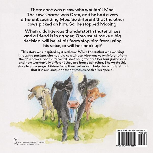 There once was a cow who wouldn't Moo! The cow's name was Oreo, and he had a very different sounding Moo. So different that the other cows picked on him. So, he stopped Mooing! When a dangerous thunderstorm materializes and a friend is in danger, Oreo must make a big decision: will he let his fears stop him from using his voice, or will he speak up? This story was inspired by a real cow. While the author was walking through a pasture, she heard a cow whose Moo was very different from the other cows. Soon afterward, she thought about her four grandsons and how wonderfully different they are from each other. She wrote this story to encourage children to be themselves and help them understand that it is our uniqueness that makes each of us special.