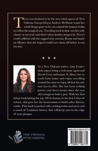 As a New Orleans native, Amy Exsterstein enjoys being a real estate agent and Mardi Gras enthusiast. It allows her to work from home and enjoy travelling around her state to enjoy all that the culture has to offer. She has been writing poetry and short stories since she was old enough to hold a pen. With her first debut book hitting the top 100 in fantasy in the first 2 days of release, this gave her the momentum to fi nish other literary works. This book is packed with exciting twists and turns and a touch of Louisiana history that will keep you on the edge history that will keep you on the edge of your pirogue.