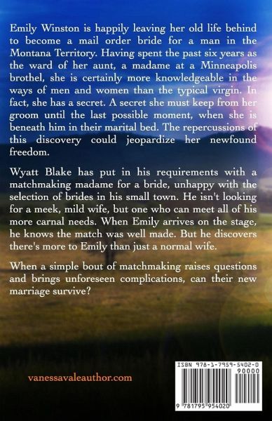 When a simple bout of matchmaking raises questions and brings unforeseen complications, can their new marriage survive? Emily Winston is happily leaving her old life behind to become a mail order bride for a man in the Montana Territory. Having spent the past six years as the ward of her aunt, a madame at a Minneapolis brothel, she is certainly more knowledgeable in the ways of men and women than the typical virgin. In fact, she has a secret. A secret she must keep from her groom until the last possible moment, when she is beneath him in their marital bed. The repercussions of this discovery could jeopardize her newfound freedom. Wyatt Blake has put in his requirements with a matchmaking madame for a bride, unhappy with the selection of brides in his small town. He isn't looking for a meek, mild wife, but one who can meet all of his more carnal needs. When Emily arrives on the stage, he knows the match was well made. But he discovers there's more to Emily than just a normal wife.