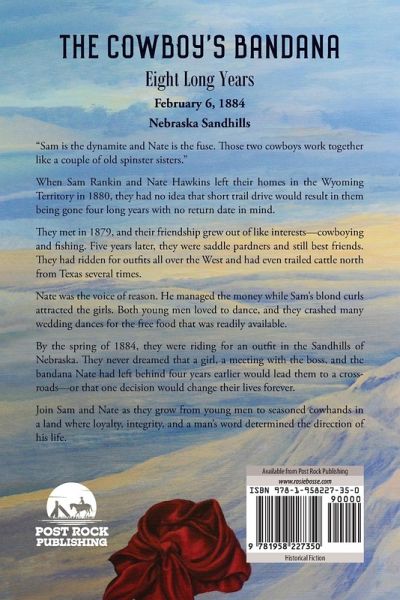 February 6, 1884 Nebraska Sandhills "Sam is the dynamite and Nate is the fuse. Those two cowboys work together like a couple of old spinster sisters." When Sam Rankin and Nate Hawkins left their homes in the Wyoming Territory in 1880, they had no idea that short trail drive would result in them being gone four long years with no return date. The two young men had met in 1879, and their friendship grew out of like interests-cowboying and fishing. Four years later, they were saddle partners and still best friends. They had ridden for outfits all over the West and had even trailed cattle north from Texas several times. Nate was the voice of reason. He managed the money and Sam's blond curls attracted the girls. Both loved to dance, and they crashed many wedding dances for the free food that was readily available. By the spring of 1884, they were riding for an outfit in the Sandhills of Nebraska. They never dreamed that a girl, a meeting with the boss, and the bandana Nate had left behind four years earlier would lead them to a crossroad in their lives. Will the decisions they face change the course of their lives and their friendship in the process? Join Sam and Nate as they grow from young men to seasoned cowhands in a land where loyalty, integrity, and a man's word determine the direction of his life.