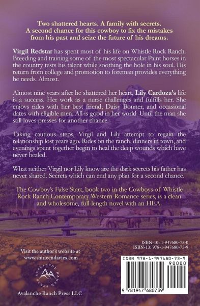 Two shattered hearts. A family with secrets. A second chance for this cowboy to fix the mistakes from his past and seize the future of his dreams. Virgil Redstar has spent most of his life on Whistle Rock Ranch. Breeding and training some of the most spectacular Paint horses in the country tests his talent while soothing the hole in his soul. His return from college and promotion to foreman provides everything he needs. Almost. Almost nine years after he shattered her heart, Lily Cardoza's life is a success. Her work as a nurse challenges and fulfills her. She enjoys rides with her best friend, Daisy Bonner, and occasional dates with eligible men. All is good in her world. Until the man she still loves presses for another chance. Taking cautious steps, Virgil and Lily attempt to regain the relationship lost years ago. Rides on the ranch, dinners in town, and evenings spent together begin to heal the deep wounds which have never healed. What neither Virgil nor Lily know are the dark secrets his father has never shared. Secrets which can end any plan for a second chance. The Cowboy's False Start, book two in the Cowboys of Whistle Rock Ranch Contemporary Western Romance series, is a clean and wholesome, full-length novel with an HEA.