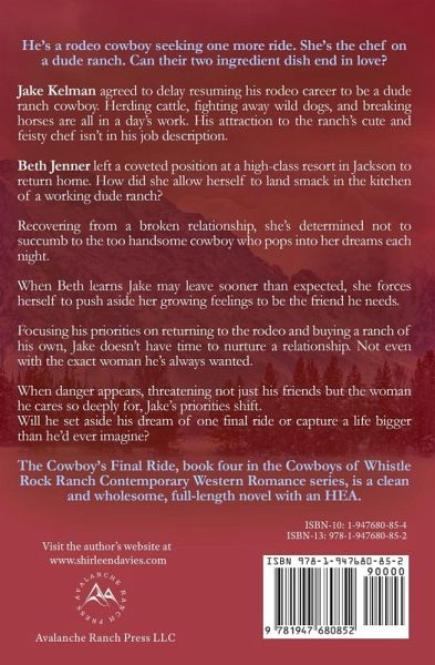 He's a rodeo cowboy seeking one more ride. She's the chef on a dude ranch. Can their two ingredient dish end in love? Jake Kelman agreed to delay resuming his rodeo career to be a dude ranch cowboy. Herding cattle, fighting away wild dogs, and breaking horses are all in a day's work. His attraction to the ranch's cute and feisty chef isn't in his job description. Beth Jenner left a coveted position at a high-class resort in Jackson to return home. How did she allow herself to land smack in the kitchen of a working dude ranch? Recovering from a broken relationship, she's determined not to succumb to the too handsome cowboy who pops into her dreams each night. When Beth learns Jake may leave sooner than expected, she forces herself to push aside her growing feelings to be the friend he needs. Focusing his priorities on returning to the rodeo and buying a ranch of his own, Jake doesn't have time to nurture a relationship. Not even with the exact woman he's always wanted. When danger appears, threatening not just his friends but the woman he cares so deeply for, Jake's priorities shift. Will he set aside his dream of one final ride or capture a life bigger than he'd ever imagine? The Cowboy's Final Ride, book four in the Cowboys of Whistle Rock Ranch Contemporary Western Romance series, is a clean and wholesome, full-length novel with an HEA.