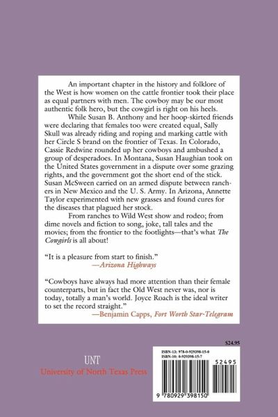An important chapter in the history and folklore of the West is how women on the cattle frontier took their place as equal partners with men. The cowboy may be our most authentic folk hero, but the cowgirl is right on his heels. This Spur Award-winning book fills a void in the history of the cowgirl. While Susan B. Anthony and her hoop-skirted friends were declaring that females too were created equal, Sally Skull was already riding and roping and marking cattle with her Circle S brand on the frontier of Texas. Wearing rawhide bloomers and riding astride, she thought nothing of crossing the border into Mexico, unchaperoned, to pursue her career as a horse trader. In Colorado, Cassie Redwine rounded up her cowboys and ambushed a group of desperadoes; Ann Bassett, also of Colorado, backed down a group of men who tried to force her off the open range. In Montana, Susan Haughian took on the United States government in a dispute over some grazing rights, and the government got the short end of the stick. Susan McSween carried on an armed dispute between ranchers in New Mexico and the U.S. Army, and other interested citizens; and in Arizona, Annette Taylor experimented with new grasses and found cures for the diseases that plagued her stock. In the years of the Civil War, women were called upon to do many things that would have been unheard of in peacetime. When the people moved west after the war, women were obliged to keep doing these things if the family was to survive. Still other groups of women-second generation cattle-country women-did men's jobs because they were good at it. Some participated in Wild West shows and made reputations for themselves in rodeo as trick and bronc riders. Cowgirls are chronicled through trail driving, ranching, gun-toting, rustling, bronc riding, and rodeoing in this updated and revised edition of The Cowgirls. JOYCE GIBSON ROACH grew up in Jacksboro, Texas, where her rural roots in ranch country provide much of the substance of her writing in non-fiction, fiction, humorous narrative, musical folk drama and children's stories. A member of the Texas Institute of Letters and member and past president of the Texas Folklore Society, she is also a two-time winner of the Spur Award from Western Writers of America and is the winner of the Carr P. Collins Award for nonfiction from the TIL. In her youth, Joyce rode barrel races and she made a fair hand at roundup, as long as she got to stay on horseback.