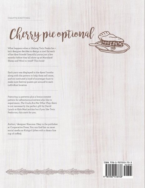 Cherry pie optional. What happens when a lifelong Twin Peaks fan + knit designer decides to design a cowl for each of her dyer friends' beautiful yarns just a few months before they all show up at Maryland Sheep and Wool to vend? This book! Featuring 14 patterns plus a bonus sweater pattern for adventurous knitters who like to experiment, The Cowls Are Not What They Seem is not necessarily the perfect gift for David Lynch or Kyle MacLachlan but if you like Twin Peaks too, this one's for you. Author / designer Shannon Okey is the publisher at Cooperative Press. You can find her on most social media as Knitgrrl (often with a damn fine cup of coffee).
