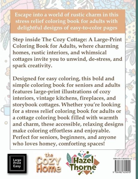 Escape into a World of Cozy Charm and Relaxation! Step inside The Cozy Cottage: A Large-Print Coloring Book for Adults, where charming homes, rustic interiors, and whimsical cottages invite you to unwind, de-stress, and spark creativity. Designed for easy coloring, this bold and simple coloring book for seniors and adults features large-print illustrations of cozy interiors, vintage kitchens, fireplaces, and storybook cottages. Whether you're looking for a stress relief coloring book for adults or a cottage coloring book filled with warmth and charm, these accessible, relaxing designs make coloring effortless and enjoyable. Perfect for seniors, beginners, and anyone who loves homey, comforting spaces! Features: ¿ Large-Print, Bold Designs - Easy on the eyes and simple to color ¿ Cozy Home Interiors & Cottage Scenes - Relaxing, charming, and inviting ¿ Perfect for Stress Relief & Mindfulness - A peaceful escape from daily stress ¿ For Adults & Seniors - Enjoyable for all skill levels Bring warmth and relaxation to your coloring time-order now and create your own cozy retreat!