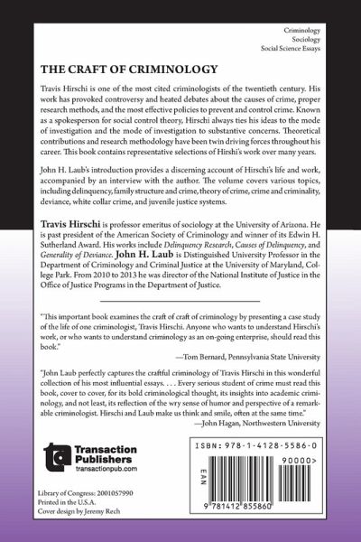 It is remarkable how little is known about Hirschi's life and career. John H. Laub's introduction combines a discerning account of Hirschi's life and work, accompanied by an interview with the author. Laub's volume covers various topics: methodological issues; principles of casual analysis; criteria of causality; longitudinal research on crime; rules and the study of deviant behavior;correlations between crime and delinquency; control theory of delinquency; intelligence, causes, and prevention of delinquency; family structure and crime; theory of crime; crime and criminality; deviance; white collar crime; and juvenile justice systems.