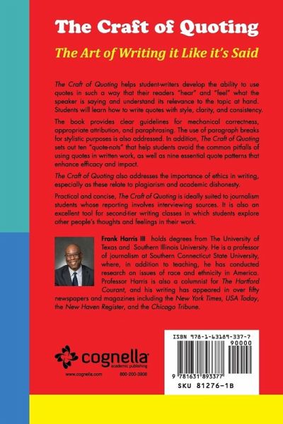 The Craft of Quoting helps student-writers develop the ability to use quotes in such a way that their readers "hear" and "feel" what the speaker is saying and understand its relevance to the topic at hand. Students will learn how to write quotes with style, clarity, and consistency. The book provides clear guidelines for mechanical correctness, appropriate attribution, and paraphrasing. The use of paragraph breaks for stylistic purposes is also addressed. In addition, The Craft of Quoting sets out twelve "quote-nots" that help students avoid the common pitfalls of using quotes in written work, as well as nine essential quote patterns that enhance efficacy and impact. The Craft of Quoting also addresses the importance of ethics in writing, especially as these relate to plagiarism and academic dishonesty. Practical and concise, The Craft of Quoting is ideally suited to journalism students whose reporting involves interviewing sources. It is also an excellent tool for second-tier writing classes in which students explore other people's thoughts and feelings in their work.