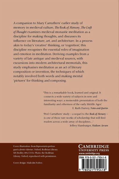 The Craft of Thought, first published in 1998, examines medieval monastic meditation as a discipline for making thoughts, and discusses its influence on literature, art, and architecture, deriving examples from a variety of late antique and medieval sources, with excursions into modern architectural memorials.