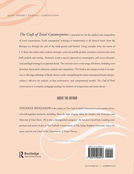 "The Craft of Tonal Counterpoint" is an introductory text to the analysis and composition of tonal counterpoint. Using examples from the music of J.S. Bach - the master of this style - the author takes students through a series of carefully graded, cumulative exercises that stress both analysis and writing. Benjamin covers chromaticism and fugal writing in exceptional detail. The exercises cover a wide range of formats, including error detection, linear pitch reduction, analysis and composition. The book also incorporates a 100-page anthology of scores, effective for analysis, in-class performance, and compositional models.