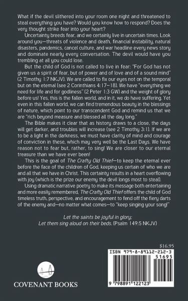 What if the devil slithered into your room one night and threatened to steal everything you have? Would you know how to respond? Does the very thought strike fear into your heart? Uncertainty breeds fear, and we certainly live in uncertain times. Look around you--threats of violence and death, financial instability, natural disasters, pandemics, cancel culture, and war headline every news story and dominate nearly every conversation. The devil would have you trembling at all you could lose. But the child of God is not called to live in fear: "For God has not given us a spirit of fear, but of power and of love and of a sound mind" (2 Timothy 1:7 NKJV). We are called to fix our eyes not on the temporal but on the eternal (see 2 Corinthians 4:17-18). We have "everything we need for life and for godliness" (2 Peter 1:3 GW) and the weight of glory before us! Yes, this is the fallen world, and in it, we do have suffering. Yet even in this fallen world, we can find tremendous beauty in the blessings of nature, which point to our transcendent God and remind us that we are "rich beyond measure and blessed all the day long." The Bible makes it clear that as history draws to a close, the days will get darker, and troubles will increase (see 2 Timothy 3:1). If we are to be a light in the darkness, we must have clarity of mind and courage of conviction in these, which may very well be the Last Days. We have reason not to fear but, rather, to sing! We are closer to our eternal treasure than we have ever been! This is the goal of The Crafty Old Thief--to keep the eternal ever before the face of the children of God, keeping us certain of who we are and all that we have in Christ. This certainty results in a heart overflowing with joy (which is the prize our enemy the devil longs most to steal). Using dramatic narrative poetry to make its message both entertaining and more easily remembered, The Crafty Old Thief offers the child of God timeless truth, perspective, and encouragement to fend off the fiery darts of the enemy and--no matter what comes--to "keep singing your song!" Let the saints be joyful in glory; Let them sing aloud on their beds. (Psalm 149:5 NKJV)