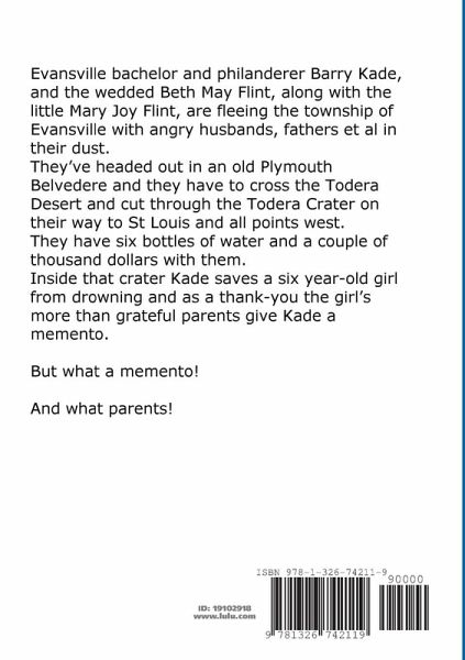 Evansville bachelor and philanderer Barry Kade, and the wedded Beth May Flint, along with the little Mary Joy Flint, are fleeing the township of Evansville with angry husbands, fathers et al in their dust. They've headed out in an old Plymouth Belvedere and they have to cross the Todera Desert and cut through the Todera Crater on their way to St Louis and all points west. They have six bottles of water and a couple of thousand dollars with them. Inside that crater Kade saves a six year-old girl from drowning and as a thank-you the girl's more than grateful parents give Kade a memento. But what a memento! And what parents!
