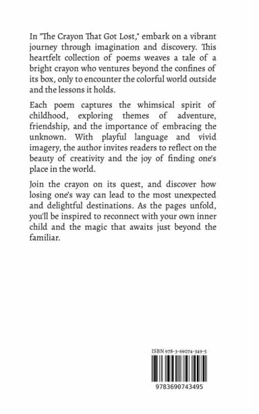 In "The Crayon That Got Lost," embark on a vibrant journey through imagination and discovery. This heartfelt collection of poems weaves a tale of a bright crayon who ventures beyond the confines of its box, only to encounter the colorful world outside and the lessons it holds. Each poem captures the whimsical spirit of childhood, exploring themes of adventure, friendship, and the importance of embracing the unknown. With playful language and vivid imagery, the author invites readers to reflect on the beauty of creativity and the joy of finding one's place in the world. Join the crayon on its quest, and discover how losing one's way can lead to the most unexpected and delightful destinations. As the pages unfold, you'll be inspired to reconnect with your own inner child and the magic that awaits just beyond the familiar.