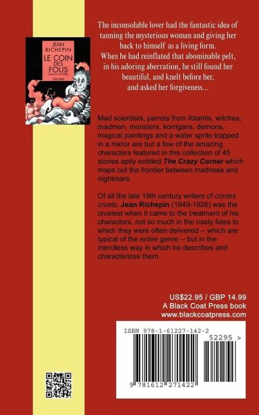 Mad scientists, parrots from Atlantis, witches, madmen, monsters, korrigans, demons, magical paintings and a water sprite trapped in a mirror are but a few of the amazing characters featured in this collection of 45 stories from the 1890s and early 1900s, aptly entitled The Crazy Corner, which maps out the frontier between madness and nightmare. Of all the late 19th century writers of contes cruels, Jean Richepin (1849-1926) was the cruelest when it came to the treatment of his characters, not so much in the nasty fates to which they were often delivered -- which are typical of the entire genre -- but in the merciless way in which he describes and characterizes them.