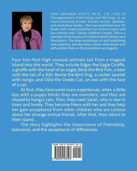 Four two -foot high unusual animals sail from a magical island into this world. They include Edgar the Eagle Giraffe, a giraffe with the head of a bird; Benji the Bear Fish, a bear with the tail of a fish; Bertie the Bird Dog, a cocker spaniel with wings; and Ollie the Owley Cat, an owl with the face of a cat. At first, they have some scary experiences, when a little boy with a puppy thinks they are monsters and they are chased by hungry cats. Then, they meet Sarah, who is new in town and lonely. They become friends with her, and they help her gain acceptance from other children who are curious about her strange animal friends. After that, they return to their island. The story highlights the importance of friendship, tolerance, and the acceptance of differences. GINI GRAHAM SCOTT, Ph.D., J.D., CEO of Changemakers Publishing and Writing, is an internationally known known writer, speaker, and workshop leader. She has published over 50 books with major publishers on various topics and has written over 3 dozen children's books. She is a member of the Society of Children's Book Writers and Illustrators. She does workshops on self-publishing and creativity, and she helps clients write books and self-publish them or find publishers and agents.