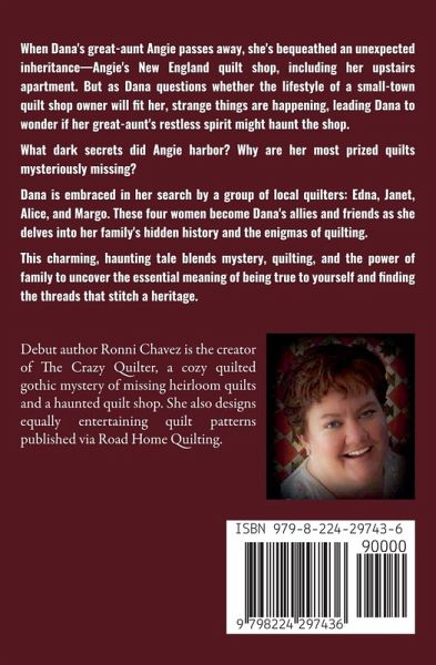 When Dana's great-aunt Angie passes away, she's bequeathed an unexpected inheritance-Angie's New England quilt shop, including her upstairs apartment. But as Dana questions whether the lifestyle of a small-town quilt shop owner will fit her, strange things are happening, leading Dana to wonder if the shop might be haunted by her great-aunt's restless spirit. What dark secrets did Angie harbor? Why are her most prized quilts mysteriously missing? And could Angie's time in a psychiatric asylum long ago somehow be connected to the supernatural occurrences Dana experiences? Faced with unearthing her family's hidden history and finding her great-aunt's legacy, Dana embarks on a journey of personal discovery. She is embraced in this quest by a group of local quilters: Edna, Janet, Alice, and Margo. These four women become Dana's allies and friends, offering her a sense of belonging and support as she delves deeper into her great-aunt's past. Through them, she comes to understand the importance of quilting for Aunt Angie and the town. This charming, haunting tale blends mystery, quilting, and the power of family to uncover the essential meaning of being true to yourself and finding the threads that stitch a heritage.