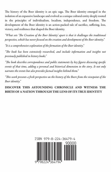 The history of the Boer identity is an epic saga. The Boer identity emerged in the isolation of an expansive landscape and evolved as a unique cultural entity deeply rooted in the principles of individualism, localism, independence, and freedom. The development of the Boer identity is an action-packed tale of sacrifice, suffering, loss, victory, and resilience that shaped the Boer identity. "What sets 'The Creation of the Boer Identity' apart is that it challenges the traditional perspective, which has never focused on the creation and development of the Boer identity." "It is a comprehensive exploration of the formation of the Boer identity." "The book has been extensively researched, and include information and insights not previously published in history books." "The book describes correspondence and public statements by key figures discussing specific events of that time, adding a personal and historical dimension to the story. It not only narrates the events but also provides factual insights behind them." "This work presents a fresh perspective on the history of the Boers from the viewpoint of the Boer identity." DISCOVER THIS ASTOUNDING CHRONICLE AND WITNESS THE BIRTH OF A NATION THROUGH THE LENS OF ITS TRUE IDENTITY
