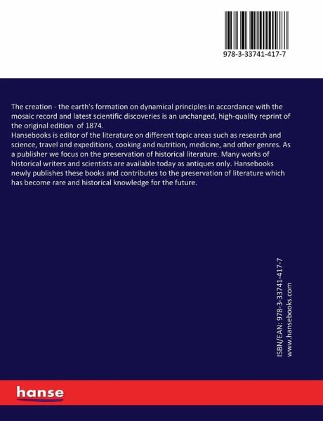 The creation - the earth's formation on dynamical principles in accordance with the mosaic record and latest scientific discoveries is an unchanged, high-quality reprint of the original edition of 1874.Hansebooks is editor of the literature on different topic areas such as research and science, travel and expeditions, cooking and nutrition, medicine, and other genres. As a publisher we focus on the preservation of historical literature. Many works of historical writers and scientists are available today as antiques only. Hansebooks newly publishes these books and contributes to the preservation of literature which has become rare and historical knowledge for the future.