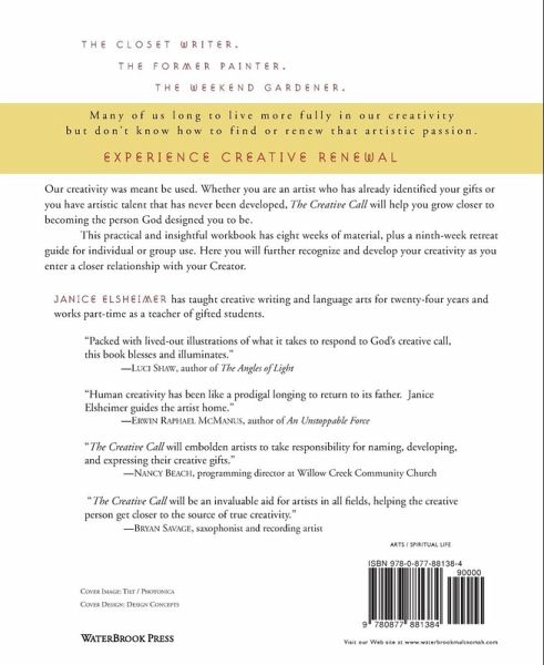 Perhaps you're a "closet writer" who's been scribbling in journals for years. Maybe you once had a passion for playing the piano or violin--a passion that is still flickering somewhere deep inside you. You may have a knack for photography, drawing, gardening, cooking, or some other creative gift. Or you may long to express yourself creatively, but have yet to discover your unique talents. Your creativity was meant be used. Whether you are an artist who has already identified your gifts or you believe that you have artistic talent that has never been developed, working through this book will help you grow closer to becoming the person God has designed you to be. *LEARN TO CALL ON THE HOLY SPIRIT AS YOUR SOURCE OF INSPIRATION * EXERCISE YOUR ARTISTIC GIFT REGULARLY AND BEGIN TO THINK OF YOURSELF AS AN ARTIST. * DEVELOP THE HABIT OF JOURNALING AS A WAY TO REALIZE UNLOCKED CREATIVITY AN EIGHT-WEEK PROGRAM FOR FULLY DEVELOPING YOUR ARTISTIC GIFTS AND ENTERING INTO A CLOSER UNION WITH GOD. INCLUDES A RETREAT GUIDE. FOR INDIVIDUAL USE OR GROUP STUDY.