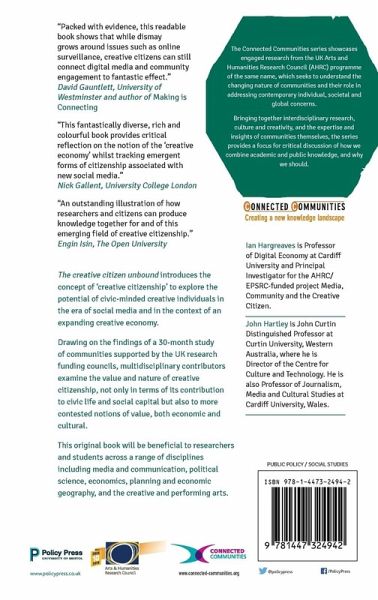 The creative citizen unbound explores the potential of civically-minded creative individuals in the era of social media and in the context of an expanding creative economy. Contributors examine creative citizenship's contribution to civic life and to social capital and its economic and cultural definitions of value.