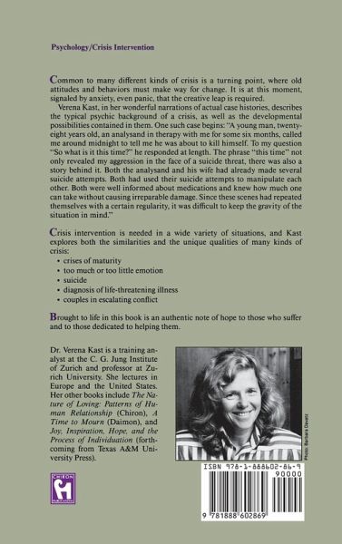 Common to many different kinds of crisis is a turning point, where old attitudes and behaviors must make way for change. It is at this moment, signaled by anxiety, even panic, that the creative leap is required. Verena Kast, in her wonderful narrations of actual case histories, describes the typical psychic background of a crisis, as well as the developmental possibilities contained in them. One such case begins: "A young man, twenty eight years old, an analysand in therapy with me for some six months, called me around midnight to tell me he was about to kill himself. To my question "So what is it this time?" he responded at length. The phrase "this time" not only revealed my aggression in the face of a suicide threat, there was also a story behind it. Both the analysand and his wife had already made several suicide attempts. Both had used their suicide attempts to manipulate each other. Both were well informed about medications and knew how much one can take without causing irreparable damage. Since these scenes had repeated themselves with a certain regularity, it was difficult to keep the gravity of the situation in mind." Brought to life in this book is an authentic note of hope to those who suffer and to those dedicated to helping them. Dr. Verena Kast is a training analyst at the C. G. Jung Institute of Zurich and professor at Zurich University. She lectures in Europe and the United States. Her other books include The Nature of Loving: Patterns of Human Relationship (Chiron), A Time to Mourn (Daimon), and Joy, Inspiration, Hope , and the Process of Individuation (Texas A&M University Press).