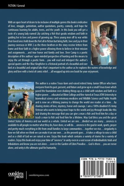 With an open heart of desire to be inclusive of multiple genres this book is indicative of love, struggle, patriotism, author quotations, poetry, comedy, and hope for continuous learning for adults, teens, and the youth. In this book you will get a taste of a young lady named Lily catching a fish that speaks wisdom and faith in guiding her in love and power of growing up. Three young men off to war while their loved ones hold down the fort all in fiction but bring faith, love and joy in their journey overseas in WW 2 as the three brothers in the story receive letters from home and their faith in a higher power allowing them to believe in their mission and assignments...and true honor and family and love. Deer Camp is a poetic description of the authors' open-minded perspective of hunting and the means to enjoy the art through a poetic form...you will read and interpret the author's special quotes and the Blue Kingfisher is a fictional portrait of a beautiful and rare bird at a beautiful and original lake that's important to the author as he explores the waters of knowledge and glory and love with a twist of comic relief...all wrapped up into one book for your enjoyment.