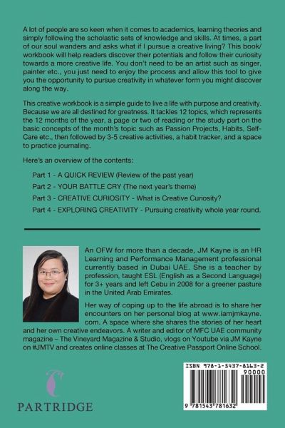 A lot of people are so keen when it comes to academics, learning theories and simply following the scholastic sets of knowledge and skills. At times, a part of our soul wanders and asks what if I pursue a creative living? This book/workbook will help readers discover their potentials and follow their curiosity towards a more creative life. You don't need to be an artist such as singer, painter etc., you just need to enjoy the process and allow this tool to give you the opportunity to pursue creativity in whatever form you might discover along the way. This creative workbook is a simple guide to live a life with purpose and creativity. Because we are all destined for greatness. It tackles 12 topics, which represents the 12 months of the year, a page or two of reading or the study part on the basic concepts of the month's topic such as Passion Projects, Habits, Self-Care etc., then followed by 3-5 creative activities, a habit tracker, and a space to practice journaling. Here's an overview of the contents: Part 1 - A QUICK REVIEW (Review of the past year) Part 2 - YOUR BATTLE CRY (The next year's theme) Part 3 - CREATIVE CURIOSITY - What is Creative Curiosity? Part 4 - EXPLORING CREATIVITY - Pursuing creativity whole year round.
