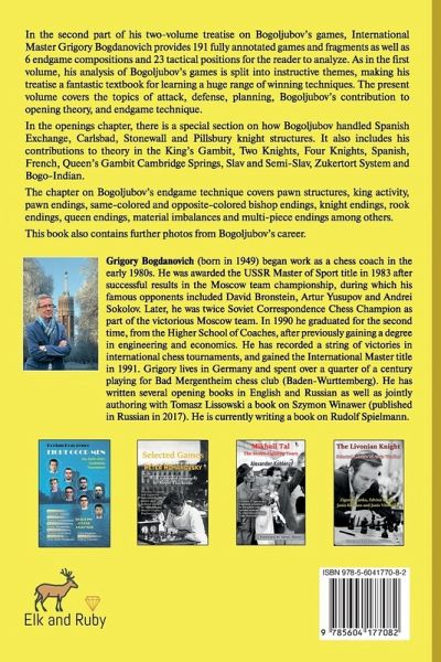In the second part of his two-volume treatise on Bogoljubov's games, International Master Grigory Bogdanovich provides 191 fully annotated games and fragments as well as 6 endgame compositions and 23 tactical positions for the reader to analyze. As in the first volume, his analysis of Bogoljubov's games is split into instructive themes, making his treatise a fantastic textbook for learning a huge range of winning techniques. The present volume covers the topics of attack, defense, planning, Bogoljubov's contribution to opening theory, and endgame technique. In the openings chapter, there is a special section on how Bogoljubov handled Spanish Exchange, Carlsbad, Stonewall and Pillsbury knight structures. It also includes his contributions to theory in the King's Gambit, Two Knights, Four Knights, Spanish, French, Queen's Gambit Cambridge Springs, Slav and Semi-Slav, Zukertort System and Bogo-Indian. The chapter on Bogoljubov's endgame technique covers pawn structures, king activity, pawn endings, same-colored and opposite-colored bishop endings, knight endings, rook endings, queen endings, material imbalances and multi-piece endings among others. This book also contains further photos from Bogoljubov's career. Check out the publisher's website for special deals on this and other books!