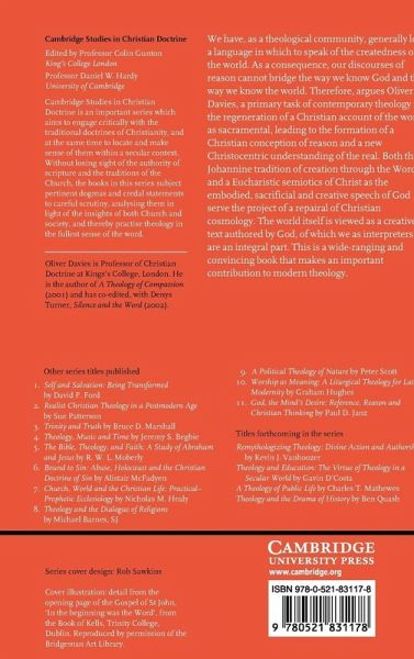 We have, as a theological community, generally lost a language in which to speak of the created-ness of the world. As a consequence, our discourses of reason cannot bridge the way we know God and the way we know the world. Therefore, argues Oliver Davies, a primary task of contemporary theology is the regeneration of a Christian account of the world as sacramental, leading to the formation of a Christian conception of reason and a new Christocentric understanding of the real. Both the Johannine tradition of creation through the Word and a Eucharistic semiotics of Christ as the embodied, sacrificial and creative speech of God serve the project of a repairal of Christian cosmology. The world itself is viewed as a creative text authored by God, of which we as interpreters are an integral part. This is a wide-ranging and convincing book that makes an important contribution to modern theology.