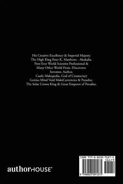 The Creatocracy Republic is first ever world state dominion now invented by Peter K. Matthews - Akukalia in his invented body of knowledge, fields of study, and academic disciplines branded MAKUPEDIA. It earned him the exalted titles as His Creative Excellency and Imperial Majesty, in accordance to scriptures from the Almighty GOD found in the book of Job 40:10 after fulfilling the supernatural cosmic instructions set out for creativity and invention of the world state in Job 38:33 and Ephesians 1:10. All things are operant on the solar core energy, lunar matter and resultant behavior from stellar core. The measurement of the solar core temperature, discovery of the diamond as key element, its applications and programming to invent the first diamond driven anti - inflation solar currencies, and successfully writing the formula for the universes emerged him the Solar Crown King. He is celebrated worldwide as the sovereign great emperor of the Paradise Nation. The Creatocracy World State Republic of Paradise is his exclusive world state and dominion housing his numerous intellectual treasures, world class institutional field assets, mind cities, royalties, and twenty - two seasons drama for learning and entertainment.