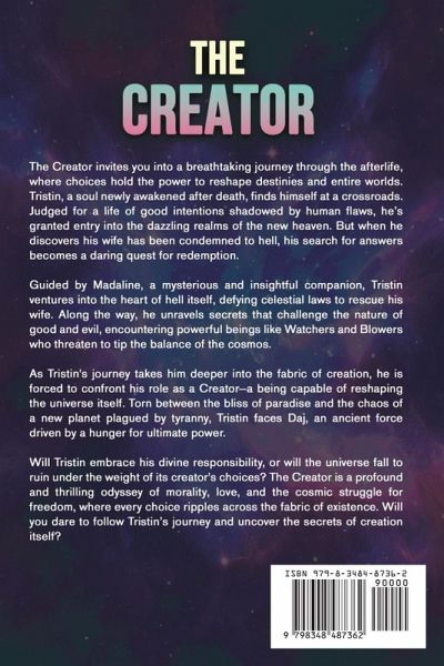 "The Creator" unfolds as a captivating exploration of the afterlife, centered around Tristin, a newly awakened soul navigating the complexities of rebirth. Grappling with judgment, choices, and the consequences of his actions, Tristin embarks on a quest to reunite with his loved ones amidst the intricate realms of heaven and hell. The narrative begins with Tristin's awakening and judgment, revealing his inherently good nature despite past transgressions. A pivotal choice propels him into the opulent new heaven, where the search for his family in the heavenly library becomes a central theme. However, the shocking revelation about his wife's fate in hell prompts Tristin to take on the perilous venture of rescuing her. Madaline, a crucial character, guides Tristin through the complexities of the afterlife, leading to unexpected turns as he explores hell, faces consequences for rule-breaking, and encounters enigmatic Watchers in a new universe. "The Creator" skillfully weaves together themes of morality, redemption, and the delicate balance between divine intervention and human choices. Tristin's journey unfolds as a thought-provoking and emotional exploration of the intricacies of the afterlife. As the story progresses, Tristin faces the consequences of his divine interventions, contemplating the balance between heavenly bliss and the turmoil on the new planet. The emergence of celestial beings, Watchers and Blowers, adds complexity to the overarching conflict against Daj's relentless pursuit of power. The narrative delves into the responsibilities and challenges Tristin faces as a Creator, touching on themes of free will, divine intervention, and the struggle against tyranny. The confrontation between Tristin and Daj becomes a turning point, leading to a transformative climax that redefines the fate of the universe. In the final chapter, the universe undergoes profound changes under Madaline's guidance, providing insight into the complexities of creation and the enduring consequences of choices. "The Creator" masterfully brings together diverse characters, magical realms, and moral dilemmas, delivering a profound exploration of the cosmic forces shaping existence.