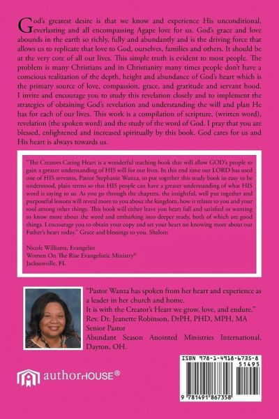 "The Creator's Caring Heart is a wonderful teaching book that will allow GOD's people to gain a greater understanding of HIS will for our lives. In this end time our LORD has used one of HIS servants, Pastor Stephanie Wanza, to put together this study book in easy to be understood, plain terms so that HIS people can have a greater understanding of what HIS word is saying to us. As you go through the chapters, the insightful, well put together and purposeful lessons will reveal more to you about the kingdom, how it relates to you and your soul among other things. This book will either leave you heart full and satisfied or wanting to know more about the word and embarking into deeper study, both of which are good things. I encourage you to obtain your copy and set your heart on knowing more about our Father's heart today." Grace and blessings to you. Shalom Nicole Williams, Evangelist Women On The Rise Evangelistic Ministry© Jacksonville, FL