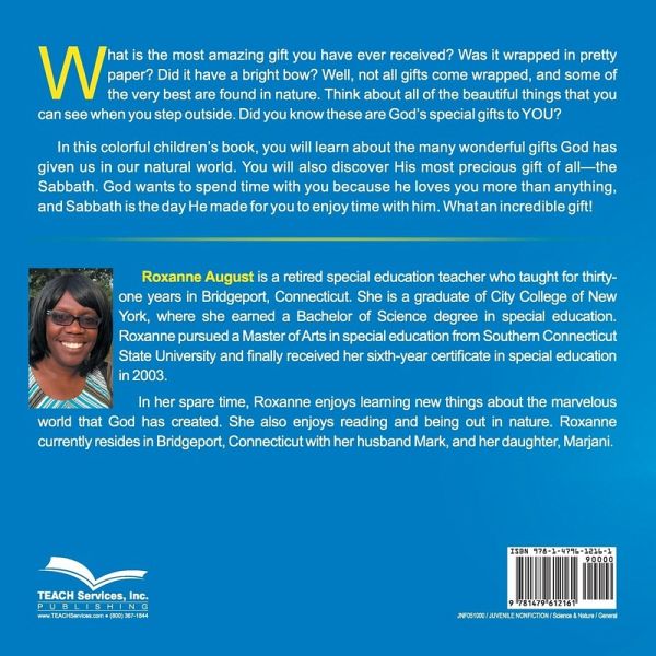 What is the most amazing gift you have ever received? Was it wrapped in pretty paper? Did it have a bright bow? Well, not all gifts come wrapped, and some of the very best are found in nature. Think about all of the beautiful things that you can see when you step outside. Did you know these are God's special gifts to YOU? In this colorful children's book, you will learn about the many wonderful gifts God has given us in our natural world. You will also discover His most precious gift of all-the Sabbath. God wants to spend time with you because He loves you more than anything, and Sabbath is the day He made for you to enjoy time with Him. What an incredible gift!