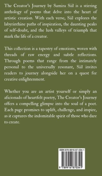 The Creator's Journey by Samira Siil is a stirring anthology of poems that delve into the heart of artistic creation. With each verse, Siil explores the labyrinthine paths of inspiration, the daunting peaks of self-doubt, and the lush valleys of triumph that mark the life of a creator. This collection is a tapestry of emotions, woven with threads of raw energy and subtle reflections. Through poems that range from the intimately personal to the universally resonant, Siil invites readers to journey alongside her on a quest for creative enlightenment. Whether you are an artist yourself or simply an aficionado of heartfelt poetry, The Creator's Journey offers a compelling glimpse into the soul of a poet. Each page promises to uplift, challenge, and inspire, as it captures the indomitable spirit of those who dare to create. Copyright © 2024 Book Fairy Publishing