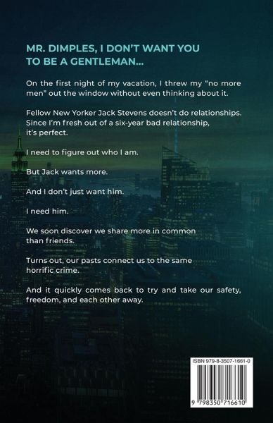 Mr. Dimples, I don't want you to be a gentleman... On the first night of my vacation, I threw my "no more men" out the window without even thinking about it. Fellow New Yorker Jack Stevens doesn't do relationships. Since I'm fresh out of a six-year bad relationship, it's perfect. I need to figure out who I am. But Jack wants more. And I don't just want him. I need him. We soon discover we share more in common than friends. Turns out, our pasts connect us to the same horrific crime. And it quickly comes back to try and take our safety, freedom, and each other away.