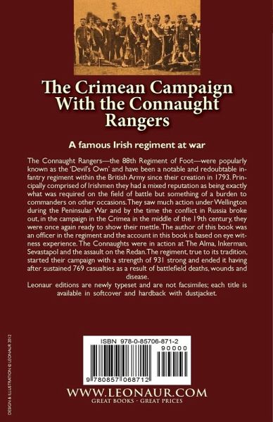 A famous Irish regiment at war The Connaught Rangers-the 88th Regiment of Foot-were popularly known as the 'Devil's Own' and have been a notable and redoubtable infantry regiment within the British Army since their creation in 1793. Principally comprised of Irishmen they had a mixed reputation as being exactly what was required on the field of battle but something of a burden to commanders on other occasions. They saw much action under Wellington during the Peninsular War and by the time the conflict in Russia broke out, in the campaign in the Crimea in the middle of the 19th century, they were once again ready to show their mettle. The author of this book was an officer in the regiment and the account in this book is based on eye witness experience. The Connaughts were in action at The Alma, Inkerman, Sevastapol and the assault on the Redan. The regiment, true to its tradition, started their campaign with a strength of 931 strong and ended it having after sustained 769 casualties as a result of battlefield deaths, wounds and disease. Leonaur editions are newly typeset and are not facsimiles; each title is available in softcover and hardback with dustjacket.