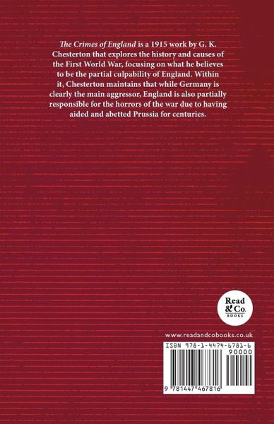 "The Crimes of England" is a 1915 work by G. K. Chesterton that explores the history and causes of the First World War, focusing on what he believes to be the partial culpability of England. Within it, Chesterton maintains that while Germany is clearly the main aggressor, England is also partially responsible for the horrors of the war due to having aided and abetted Prussia for centuries. Highly recommended for those with an interest in European history and the First World War. Contents include: "Some Words to Professor Whirlwind", "The Protestant Hero", "The Enigma of Waterloo", "The Coming of the Janissaries", "The Lost England", "Hamlet and the Danes", "The Midnight of Europe", "The Wrong Horse", "The Awakening of England", and "The Battle of the Marne". Gilbert Keith Chesterton (1874- 1936) was an English philosopher, theologian, writer, and literary and art critic. Other notable works by this author include: "Heretics, Project Gutenberg" (1905), "The Innocence of Father Brown" (1911), and "The Man Who Was Thursday" (1908). Read & Co. History is republishing this classic work now complete with a specially-commissioned new biography of the author.