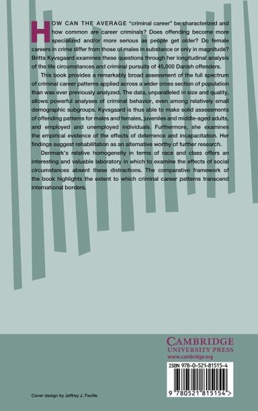 How can the average 'criminal career' be characterized and how common are career criminals? Does offending become more specialized and/or more serious as people get older? Do female careers in crime differ from those of males in substance or only in magnitude? Britta Kyvsgaard examines these questions through her longitudinal analysis of the life circumstances and criminal pursuits of 45,000 Danish offenders. This 2002 book provides a remarkably broad assessment of the full spectrum of criminal career patterns. The data, unparalleled in size and quality, allows powerful analyses of criminal behavior, even among relatively small demographic subgroups. Kyvsgaard is thus able to make solid assessments of offending patterns for males and females, juveniles and middle-aged adults, and employed and unemployed individuals. Furthermore, she examines the empirical evidence of the effects of deterrence and incapacitation. Her findings suggest rehabilitation as an alternative worthy of further research.