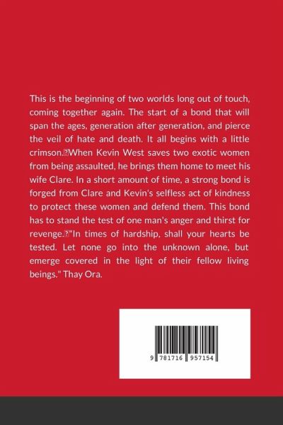 This is the beginning of two worlds long out of touch, coming together again. The start of a bond that will span the ages, generation after generation, and pierce the veil of hate and death. It all begins with a little crimson. When Kevin West saves two exotic women from being assaulted, he brings them home to meet his wife Clare. In a short amount of time, a strong bond is forged from Clare and Kevin's selfless act of kindness to protect these women and defend them. This bond has to stand the test of one man's anger and thirst for revenge. "In times of hardship, shall your hearts be tested. Let none go into the unknown alone, but emerge covered in the light of their fellow living beings." Thay Ora.