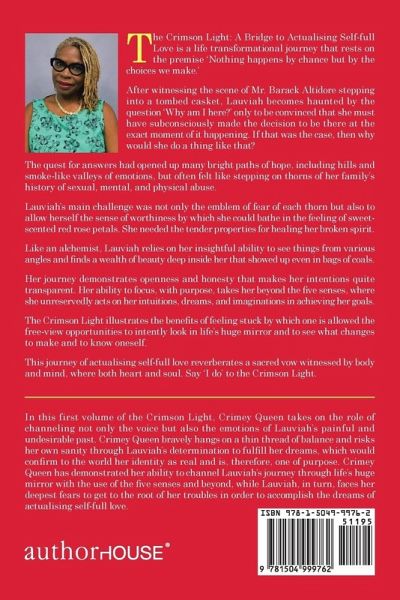 The Crimson Light: A Bridge to Actualising Self-full Love is a life transformational journey that rests on the premise 'Nothing happens by chance but by the choices we make.' After witnessing the scene of Mr. Barack Altidore stepping into a tombed casket, Lauviah becomes haunted by the question 'Why am I here?' only to be convinced that she must have subconsciously made the decision to be there at the exact moment of it happening. If that was the case, then why would she do a thing like that? The quest for answers had opened up many bright paths of hope, including hills and smoke-like valleys of emotions, but often felt like stepping on thorns of her family's history of sexual, mental, and physical abuse. Lauviah's main challenge was not only the emblem of fear of each thorn but also to allow herself the sense of worthiness by which she could bathe in the feeling of sweet-scented red rose petals. She needed the tender properties for healing her broken spirit. Like an alchemist, Lauviah relies on her insightful ability to see things from various angles and finds a wealth of beauty deep inside her that showed up even in bags of coals. Her journey demonstrates openness and honesty that makes her intentions quite transparent. Her ability to focus, with purpose, takes her beyond the five senses, where she unreservedly acts on her intuitions, dreams, and imaginations in achieving her goals. The Crimson Light illustrates the benefits of feeling stuck by which one is allowed the free-view opportunities to intently look in life's huge mirror and to see what changes to make and to know oneself. This journey of actualising self-full love reverberates a sacred vow witnessed by body and mind, where both heart and soul. Say 'I do' to the Crimson Light.